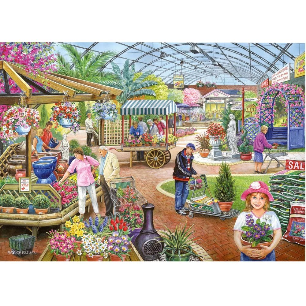 The House of Puzzles At the Garden Centre – 500 Piece Jigsaw Puzzle features a bright and bustling scene full of colour and detail. Artist Ray Cresswell brings this lively setting to life, capturing the charm of a busy garden centre filled with plants, people, and everyday moments.