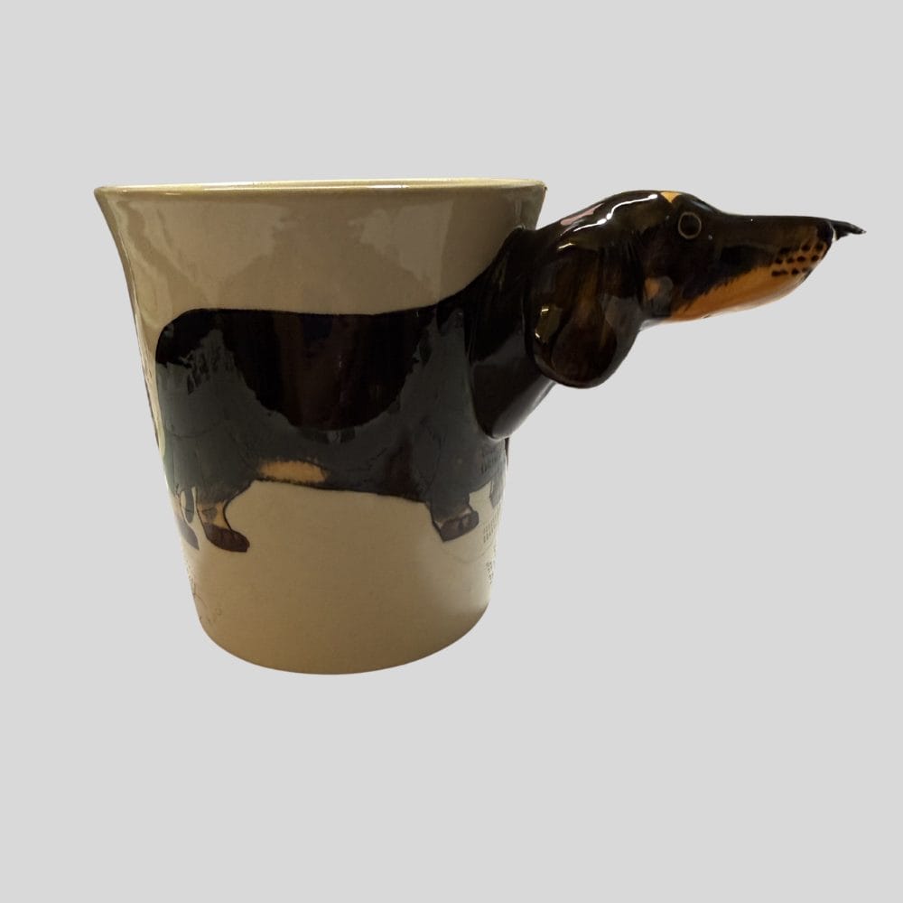 • Ceramic mug with black and tan dachshund design