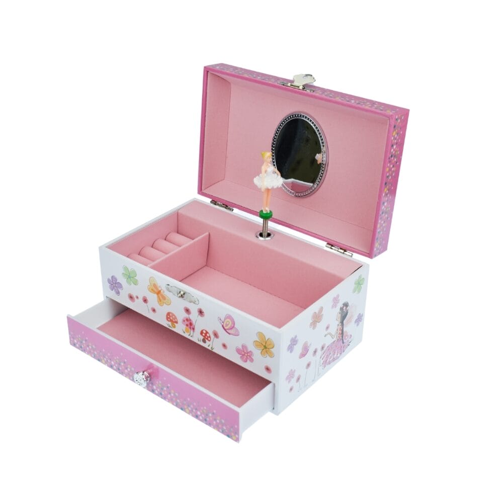 Adorned with vibrant images of blooming daisies and delightful fairy companions. This music box serves as both a whimsical decor item and a safe haven for cherished treasures.