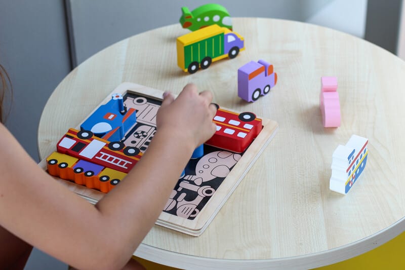 - Chunky wooden vehicle puzzle pieces