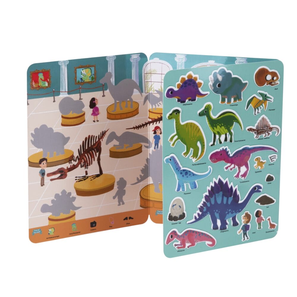Kids explore a dinosaur museum filled with fossils, exhibits, and ancient creatures. They place the silicone stickers anywhere they like. They can change the scene again and again.