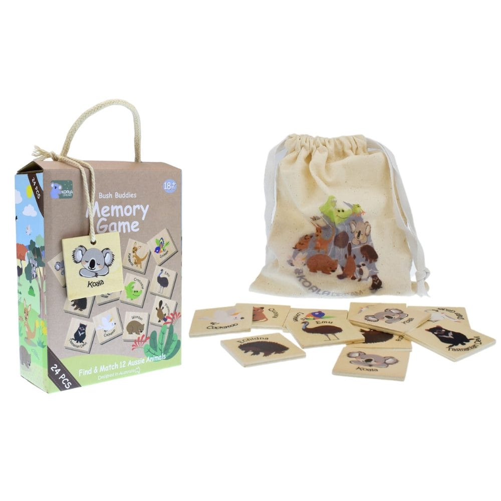 The Koala Dream Bush Buddies Wooden Memory Game is a fun and engaging way for children to build memory skills while exploring adorable Australian animals. Featuring beautifully illustrated wooden tiles, this classic matching game introduces little learners to native wildlife in a hands-on, screen-free way.